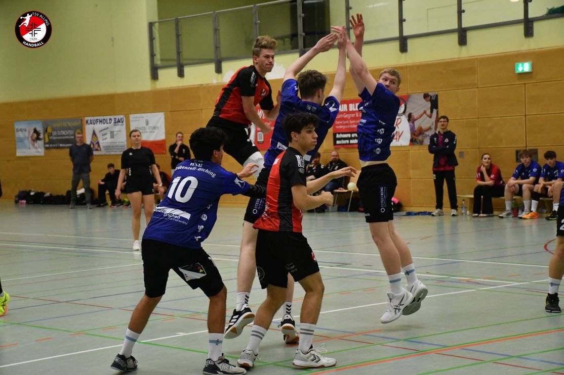 Die männliche A-Jugend des TSV Alling und der Kirchheimer SC trennten sich am Sonntag in einem torreichen Handball-Krimi mit 39:39. Dabei holten die Allinger nach einem 16:19-Halbzeitrückstand im zweiten Durchgang dank engagierter Defensivarbeit Tor um Tor auf. In einer dramatischen Schlussminute gelang dem TSV Alling kurz vor Abpfiff sogar die ersteFührung der Partie, doch Kirchheim glich wenige Sekunden vor dem Ende per Siebenmeter zum leistungsgerechten Unentschieden aus. Kirchheim erwischte den besseren Start und zog durch schnelle Angriffe und sichere Abschlüsse früh auf 1:4 davon. Allings Abwehr stellte sich jedoch rasch auf die torgefährlichen Rückraumspieler der Gäste ein. Durch ein offensives Heraustreten und gute Absprachen in der Deckung erschwerten die Allinger den Schützen des KSC zunehmend die freien Würfe. So konnten weitere einfache Gegentore verhindert werden und man konnte sich bis in die 25.Min. auf ein 14:15 heran kämpfen. Torwart Niklas L. parierte in der Anfangsphase sogar einen Siebenmeter und bewahrte sein Team vor einem höheren Rückstand. Trotz der hohen Intensität – auf beiden Seiten gab es mehrere Zeitstrafen – blieb Alling in Schlagdistanz fiel jedoch bis zur Pause wieder auf 16:19 zurück. Im zweiten Durchgang erhöhte die Allinger Mannschaft nochmals das Tempo und zeigte großen Kampfgeist. Die Defensive agierte weiterhin aufmerksam und unterband viele Tempogegenstöße des KSC frühzeitig, indem das Team bei Ballverlust sofort auf Rückzug schaltete. Im Positionsangriff fand Alling durch zwei Kreisläufer nun immer häufiger Lücken. Angeführt vom treffsicheren Rückraumspieler Patrick A. (13 Tore) holte der TSV Tor um Tor auf. Marius B. (8 Tore) und Nevio G. trafen zudem in wichtigen Momenten. Auch Kirchheims beste Schützen – David H. und Miko F. mit je 9 Treffern – ließen nicht nach, konnten jedoch von ihre Durchschnittsleistung von 15 Toren abgehalten werden. sodass sich in der Schlussviertelstunde ein offener Schlagabtausch entwickelte: Den Allingern gelang endlich der Ausgleich, und die Führung wechselte beinahe mit jedem Angriff. Die entscheidenden Szenen folgten in der letzten Minute: Als Patrick A. rund 45 Sekunden vor Schluss zum 39:38 traf, war die Sensation greifbar. Doch Kirchheim bekam noch einen letzten Angriffsversuch zugesprochen und nutzte diesen eiskalt – ein Siebenmeterwurf brachte den 39:39-Ausgleich wenige Augenblicke vor dem Schlusspfiff. Im letzten Versuch doch noch zwei Punkte zu sichern fehlten dem Nachwuchs des TSV Hollywood jedoch 2 Sekunden, mit diesen hätte der letzte Treffer von Marius B. doch noch den Sieg versprochen. Trotz des verpassten Sieges kann der TSV Alling mit dem gewonnenen Punkt zufrieden sein. Beide Teams boten dem Publikum ein temporeiches Offensivspektakel und zeigten gleichzeitig phasenweise starke Abwehrleistungen. Damit untermauert Allings A-Jugend ihre Moral und bleibt in der laufenden BHV-Saison weiter konkurrenzfähig.